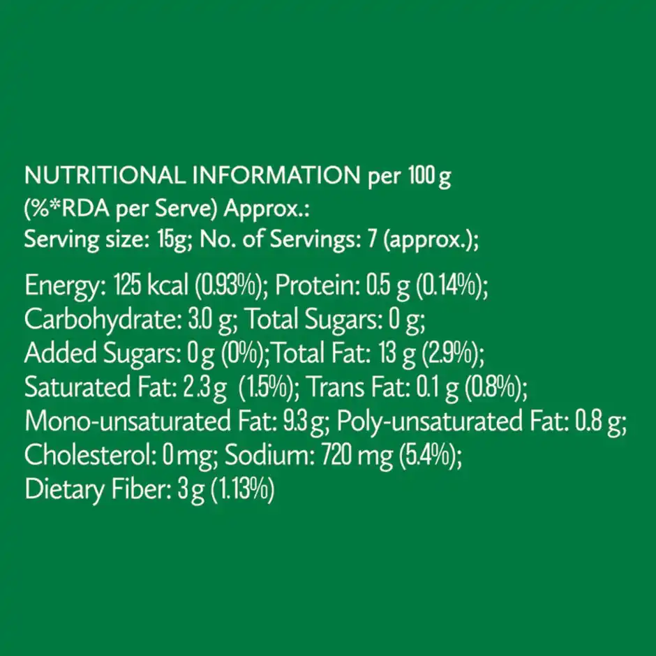 Energy (kcal) 125.0 (RDA 0.93%), Protein (g) 0.5 (RDA 0.14%), Carbohydrate (g) 3.0, Total Sugars (g) 0.0, Added Sugars (g) 0.0 (RDA 0%), Total Fat (g) 13.0 (RDA 2.9%), Saturated Fat (g) 2.3 (RDA 1.5%), Trans Fat (g) 0.1 (RDA 0.8%), Mono-unsaturated Fat (g) 9.3, Poly-unsaturated Fat (g) 0.8, Cholesterol (mg) 0.0, Sodium (mg) 720.0 (RDA 5.4%), Dietary Fiber (g) 3.0 (RDA 1.13%)