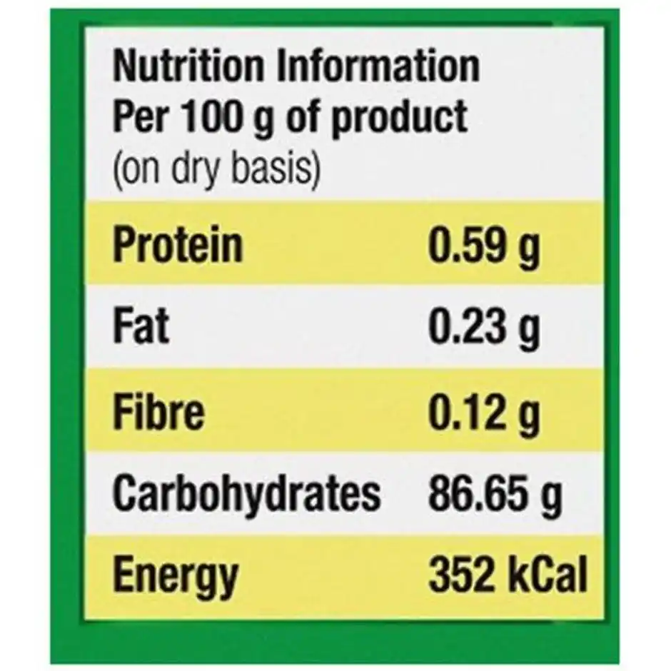 Energy (kcal) 352.0, Protein (g) 0.59, Fat (g) 0.23, Fibre (g) 0.12, Carbohydrates (g) 86.65