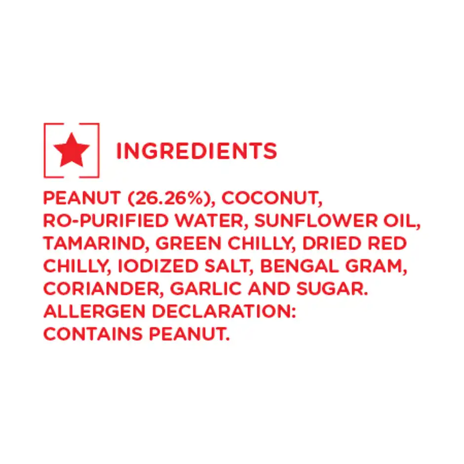 Peanut (26.26%), Coconut, Ro-Purified Water, Sunflower Oil, Tamarind, Green Chilly, Dried Red Chilly, Iodized Salt, Bengal Gram, Coriander, Garlic, and Sugar