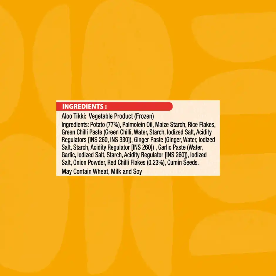 Deep Fry: Preheat oil to 175°C Take product from freezer (do not thaw) Deep fry for 3 minutes Bake: Preheat oven to 220°C Arrange frozen Aloo Tikki in single layer on baking tray Bake for 15 minutes until light golden brown Air Fryer: Preheat to 200°C Bake for 14-16 minutes until golden brown Flip halfway through Shallow Fry: Preheat little oil on medium flame Cook for 6-8 minutes, turning occasionally