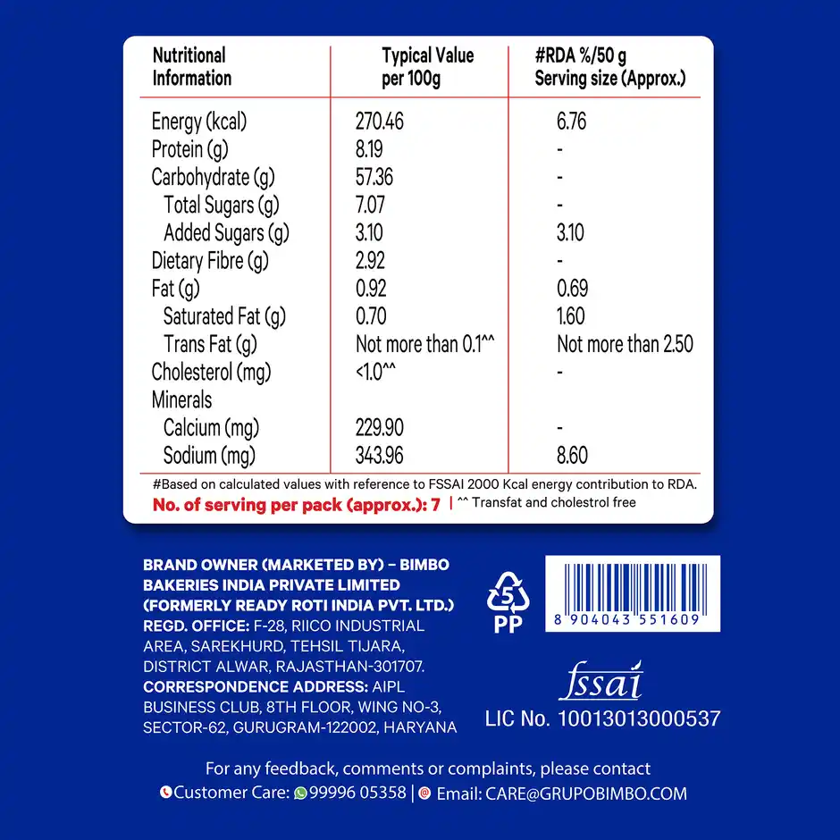 Refined Wheat Flour (Maida) (56.9%), Sugar, Milk Solids (3.4%), Yeast, Iodized Salt, Edible Vegetable Fat (Interesterified), Gluten, Soy Flour, Preservatives (282, 200), Flour Treatment Agents {341(Iii), 510}, Stabilizer {170(I)}, Emulsifier {481(I)}, Acidity Regulators (260, 297) and Antioxidant (300)